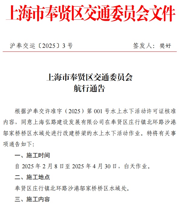 根据沪奉交许准字(2025)第001号水上水下活动许可证核准内容,同意上海弘路建设发展有限公司在奉贤区庄行镇北环路沙港邬家桥桥区水域处进行改建桥梁的水上水下活动作业。特将有关事项通告如下: