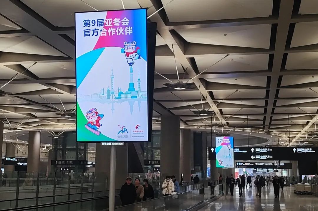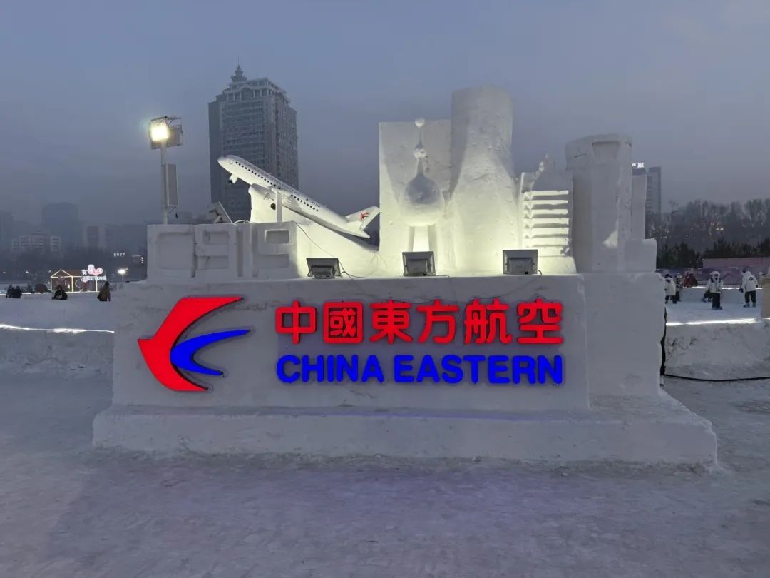 而在赛事举办地哈尔滨,东航元素也融入了“冰城”的大街小巷。在各个热门商圈和公交站点,东航布置了“第九届亚冬会官方合作伙伴”字样的行道旗、广告牌。在哈尔滨著名景点“冰雪大世界”中,雕刻有东航C919客机和上海浦江地标的冰雕建筑吸引了不少旅客“打卡拍照”。在刚刚过去的春节假期中,20余名东航乘务员也身着亚冬制服来到冰雪大世界,同来自五湖四海的旅客们“打卡”互动。东航通过系列线上线下活动,邀请广大旅客网友体验冰雪运动、品尝尔滨美食、参与冰雪文旅,将冰雪运动的“冷”资源转化为助力当地经济发展的“热”动力。