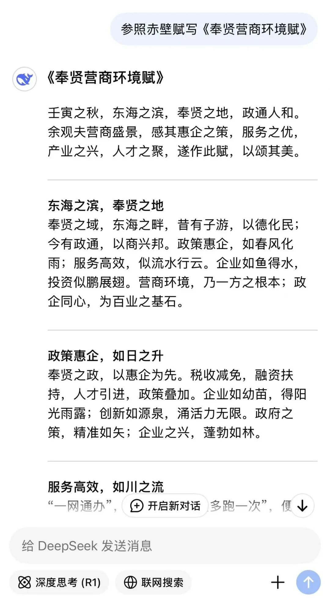 看完这篇贯通古今的《奉贤营商环境赋》,大家是不是也摩拳擦掌、跃跃欲试呢?目前,人工智能国产大模型的用途越来越多,区数据局将持续“深度求索”,借助现代数字化手段提升行政效能,为优化奉贤营商环境贡献数据力量。