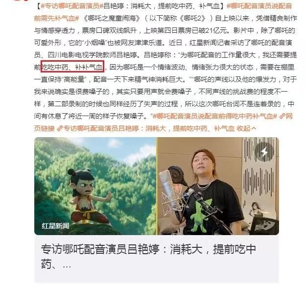 动画电影《哪吒之魔童闹海》上映以来,票房口碑双线飙升。影片中哪吒的“小烟嗓”成为不少网友津津乐道的话题。近日,哪吒的配音演员、四川电影电视学院教师吕艳婷在接受媒体采访时表示,她为“哪吒”配音的工作量很大,还需要提前吃吃中药、补补气血,因为哪吒是一个情绪波动、情绪张力很大的人物,需要在棚里一直保持“高能量”,配音一天下来精气神消耗巨大。一时间,#哪吒配音演员说配音前需先补气血# 话题冲上热搜,阅读量一度超过830万。不少网友留言想要补气血的药方。