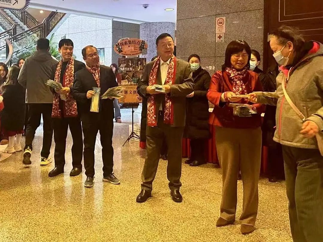馆领导迎接乙巳蛇年第一批观众,前100位观众领到“蓝莲花纹香囊”等文创礼品,相互道贺一声:“新年好!”这是上博大年初一的保留节目,为观众送上新年祝愿和喜悦。
