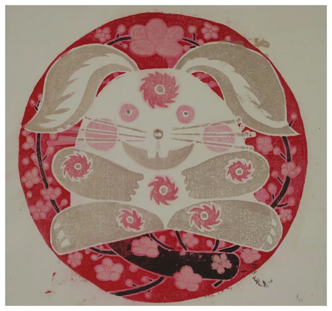 作品是为迎接2023兔年而创作的一幅吹塑纸版画。它将中国传统文化与现代审美相结合,以兔子形象为核心元素,融入了喜庆的红色,传达出新年的祥瑞气氛与美好祝愿。