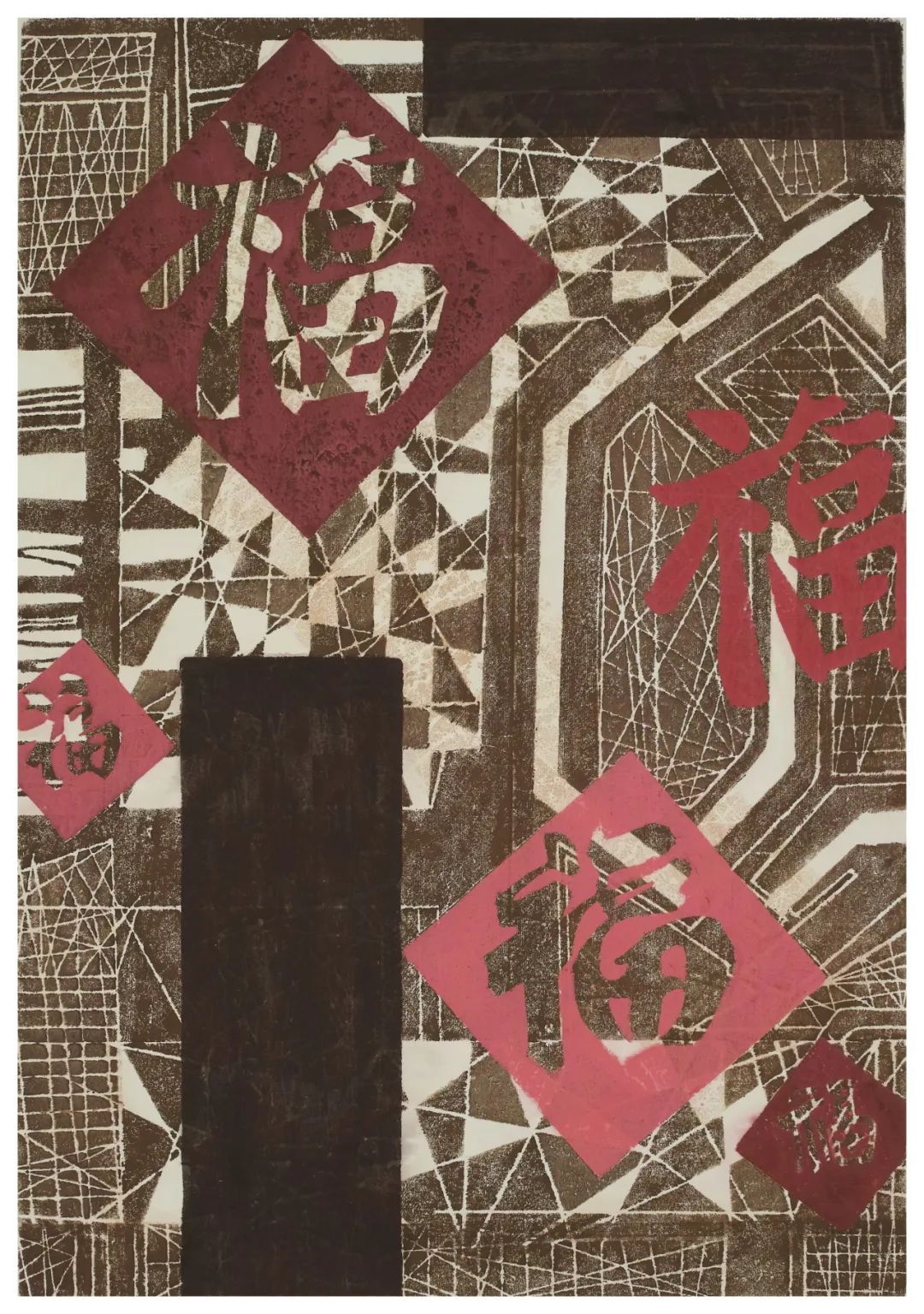 画面中,红色的福字以不同的大小和位置分布,象征着幸福和吉祥。背景采用几何线条图案,形成复杂而富有层次感的视觉效果。整体色调以深褐色和红色为主,营造出古朴而庄重的氛围。这种设计不仅体现了中国传统文化的深厚底蕴,也通过现代艺术手法赋予其新的生命力。