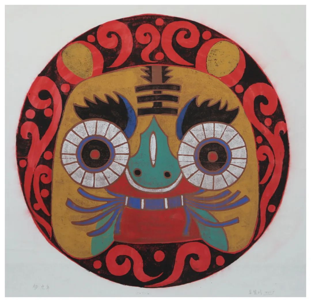 作品是一幅以中国传统农民画为灵感来源的吹塑纸版画,聚焦于虎年背景下虎头形象的创作,将民间艺术的魅力与虎年的喜庆氛围融为一体,展现了农民画质朴与热烈的艺术风格。作品以其夸张的造型、鲜明的色彩,生动再现了农民心中虎的威猛与神圣。