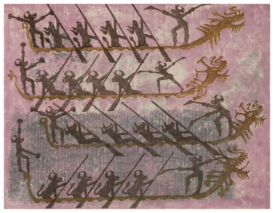 本作品拥有传统版画带来的原始的风格,背景以柔和的粉色调为主,整体构图充满了动感与活力,线条粗犷而有力,色彩对比鲜明,纹理结构多样,给人一种强烈的视觉冲击力。