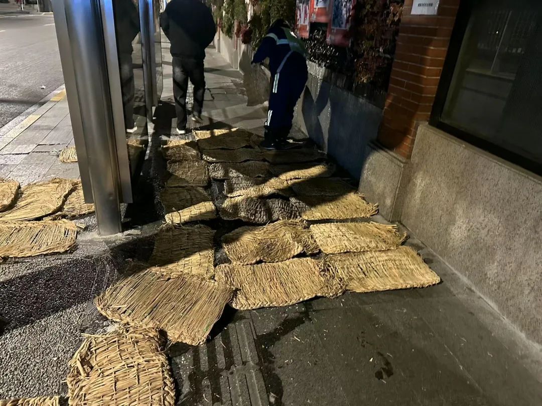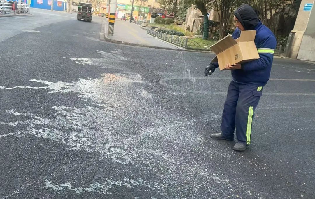 虽然此次寒潮未伴随雨雪,但道路仍会出现局部结冰的情况,给市民出行带来隐患。环卫清道职工不间断进行道路巡查,及时撒盐除冰、铺设草皮,确保车辆和行人出行安全。