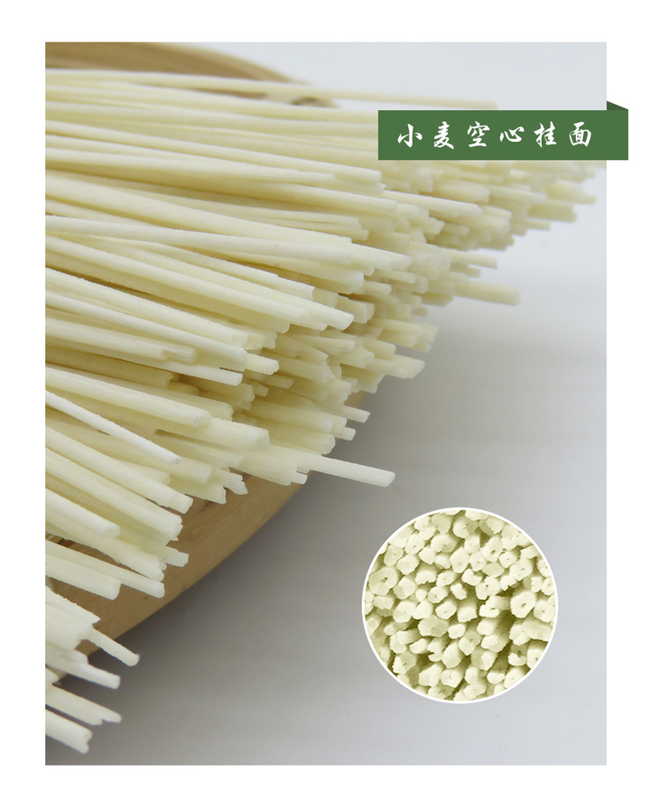 160根的挂面,远望去似水银泻地,极具美感。挂面每一根都纤细均匀,如银丝般光滑。每条挂面的横切面都形成针尖般的小孔,这也是空心挂面得名的由来。