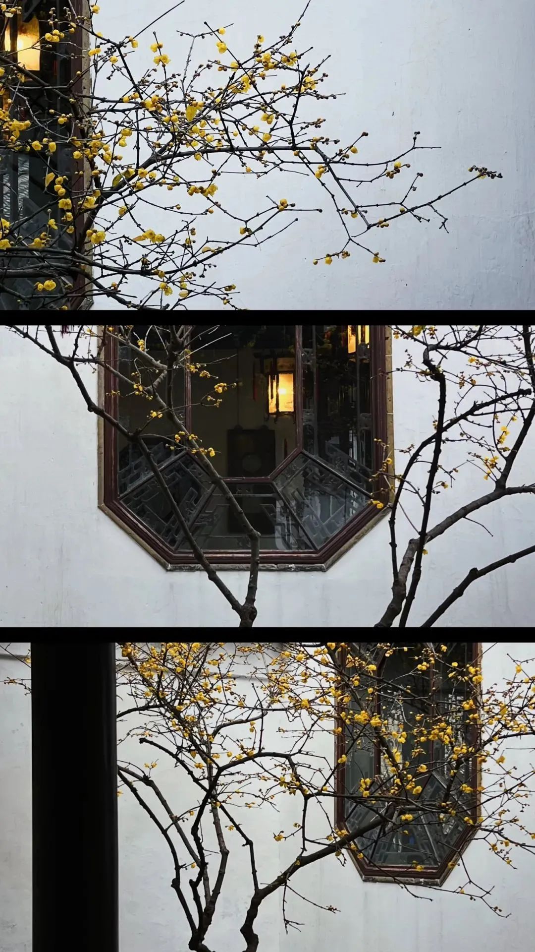 狮子林庭院一角的蜡梅以其清雅的姿态悠悠盛放,透过花窗,光影摇曳,镜头下皆是写意的苏式生活。拙政园的蜡梅分布在听雨轩南、十八曼陀罗花馆东、浮翠阁西等处,渲染出一幅幅素雅而隽永的水墨画。