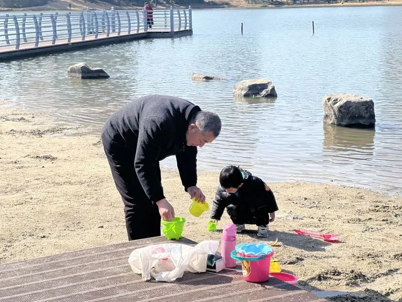 而湖边的沙坑依然是不少孩子的“最爱”,为了抓住“假期的尾巴”,家长们也陪伴孩子一同玩耍。严寒降温改变不了市民朋友阳光的心情。