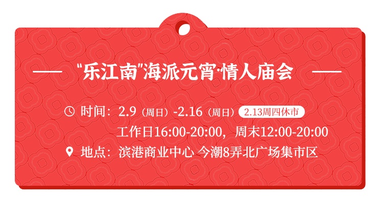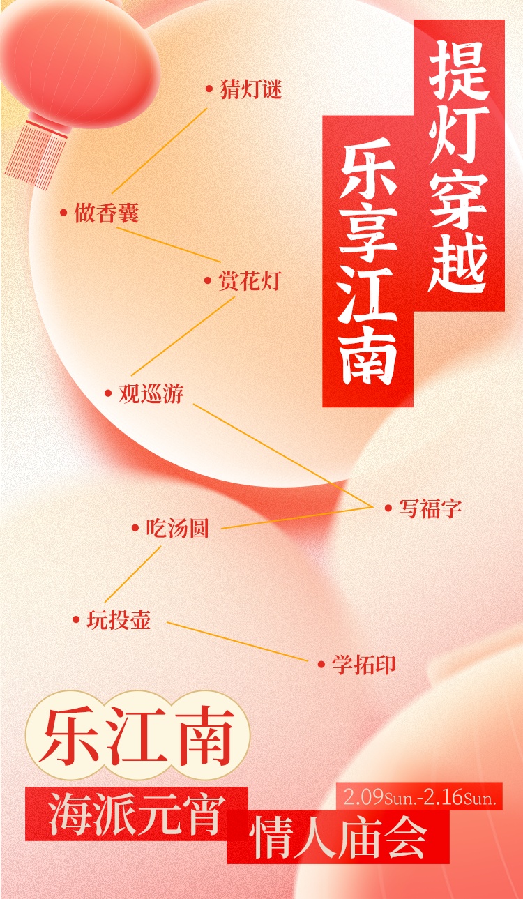 2月9日至2月16日,融合传统与新潮元素的“乐江南”海派元宵・情人庙会在沪上海派潮流地标——滨港商业中心今潮8弄热闹开启。