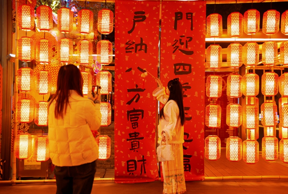 一幅幅写有“爆竹声中一岁除,春风送暖入屠苏”“好雨知时节,当春乃发生”等与喜新年、贺春归有关的诗词卷轴点缀其中,营造出诗意满满的国风意境,精准拿捏国风美学。