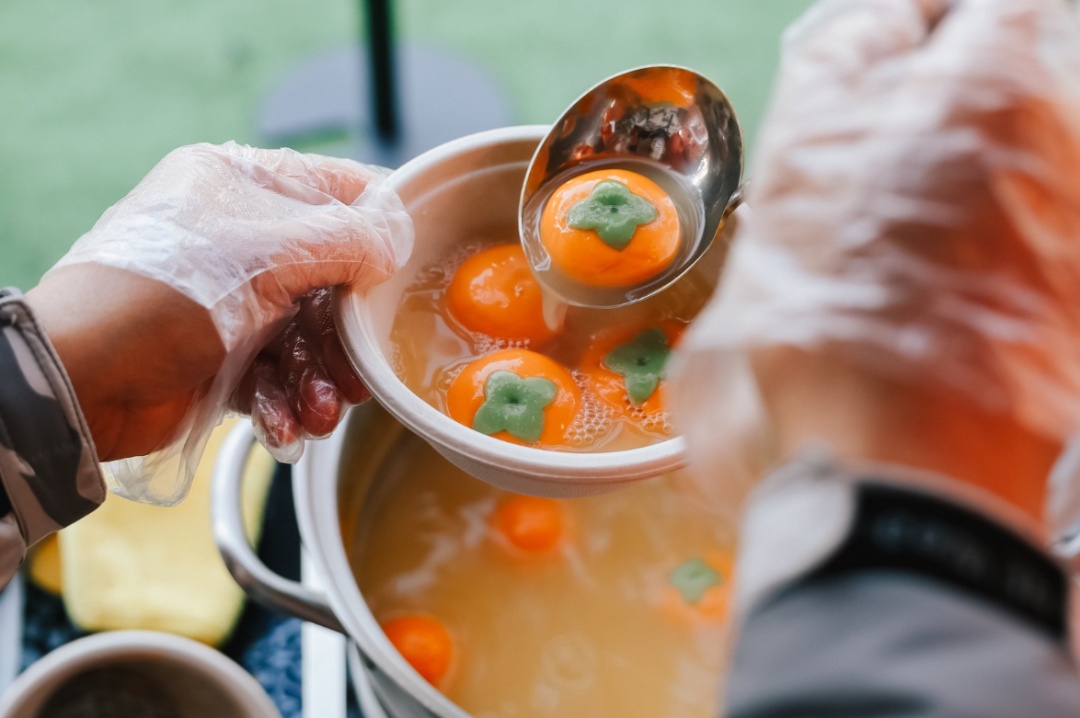 圆糯福泽铺,人们排队购买、品尝热腾腾的汤圆。