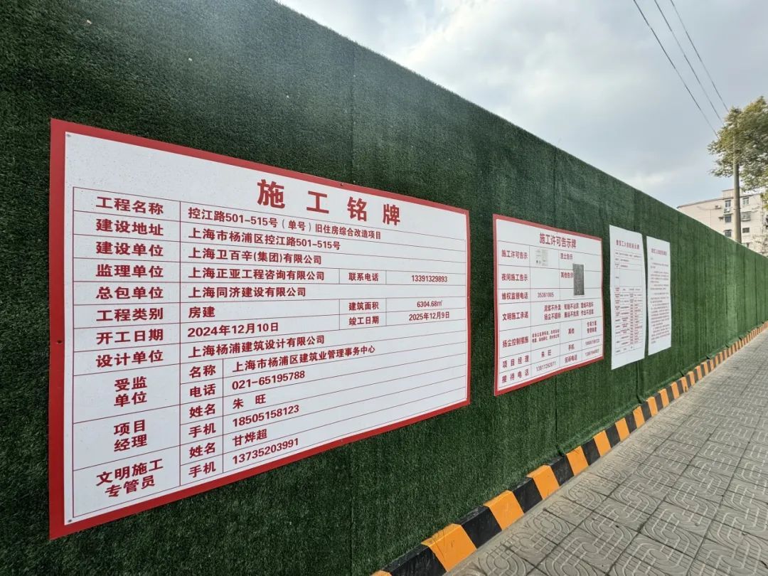 控江路501-515号(单号)原有2幢非成套老工房,建造年代为上世纪1966年,建筑老化严重,厨房和卫生间合用,配套设施落后,居住环境较差。项目拟对2幢房屋实施成套改造,预计第1季度完成桩基检测、土方作业以及底板施工;第3季度完成结构封顶;第4季度完成装饰工程。居民们有望在2026年回搬新居。