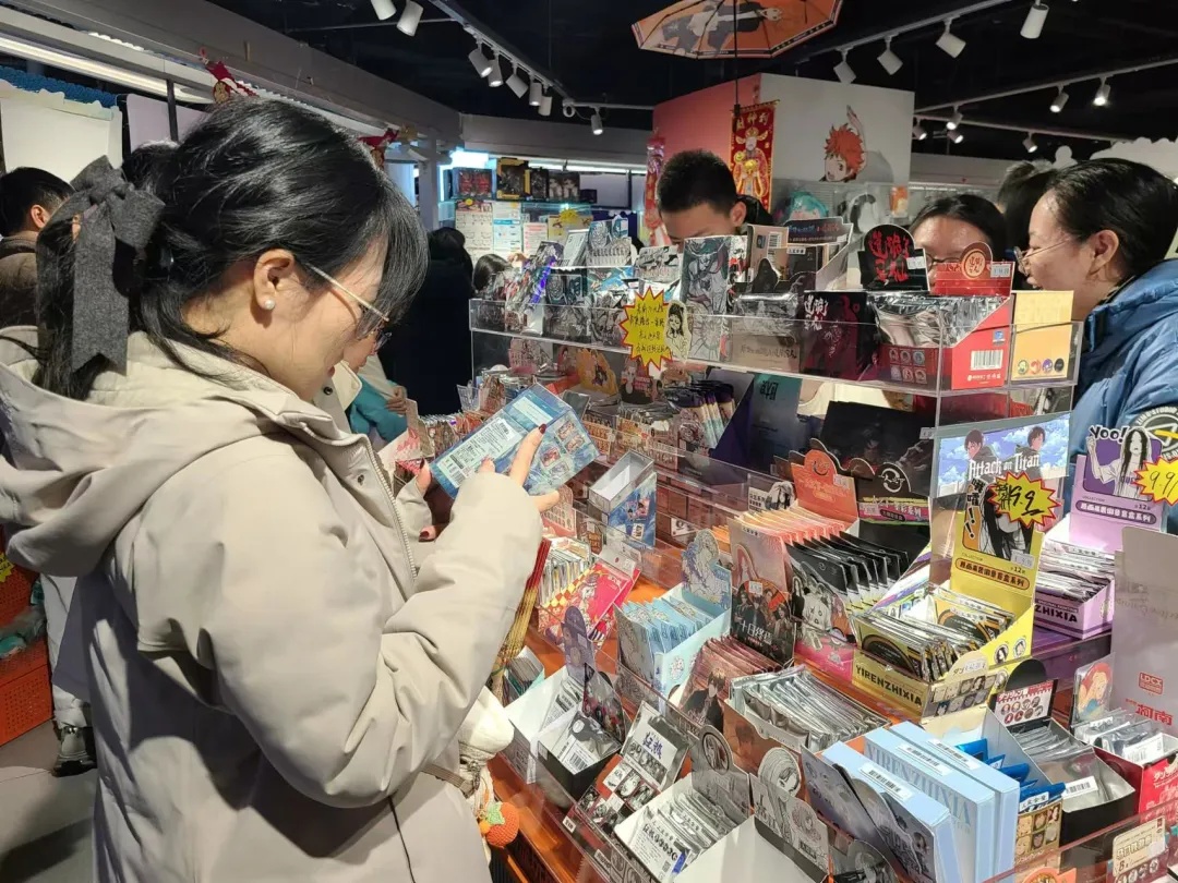 顾客查看《哪吒之魔童闹海》电影典藏版收藏卡信息,货架上拆开售卖的盒子已售空。