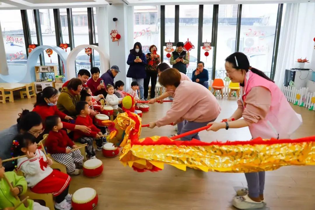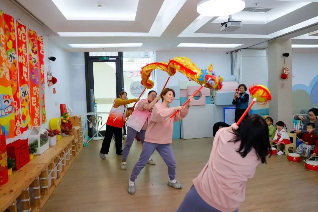 活动的重头戏莫过于老师们的舞龙表演。只见几位老师手持木棍支撑起的龙身,伴随着激昂的音乐节奏,灵活地舞动起来。舞动的纸质祥龙时而翻滚、时而跳跃,将祥龙戏珠的壮观场面演绎得淋漓尽致。孩子们被眼前这喜气洋洋的表演深深吸引,开心地发出阵阵惊叹声。家长们也被这欢乐的气氛所感染,纷纷拿出手机记录下这难忘的一刻。