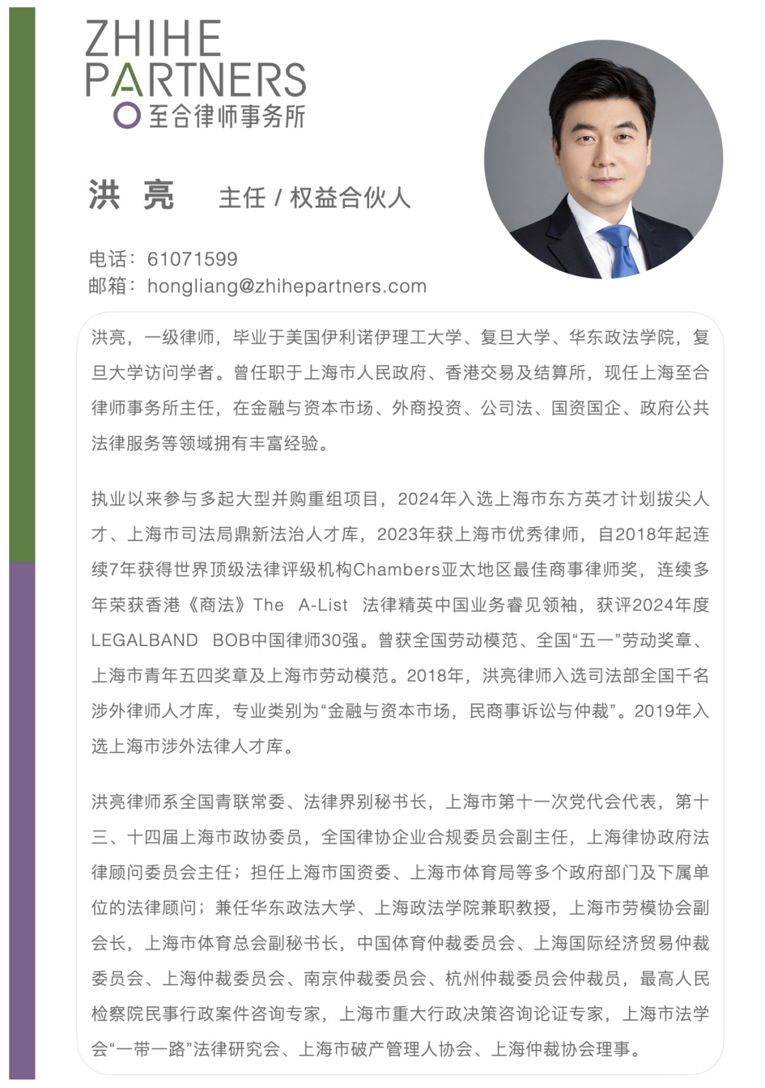 洪亮在专业的道路上不断打磨自己,以工匠精神践行一位法律人应有的职业素养。2024年入选上海市东方英才计划拔尖人才、上海市司法局鼎新法治人才库,2023年获上海市优秀律师,自2018年起连续7年获得世界顶级法律评级机构Chambers亚太地区最佳商事律师奖,连续多年荣获香港《商法》The A-List 法律精英中国业务睿见领袖,获评2024年度LEGALBAND BOB中国律师30强。曾获全国劳动模范、上海市优秀党务工作者、上海市青年五四奖章。2018年,洪亮律师入选司法部全国千名涉外律师人才库,专业类别为“金融与资本市场,民商事诉讼与仲裁”。2019年入选上海市涉外法律人才库。