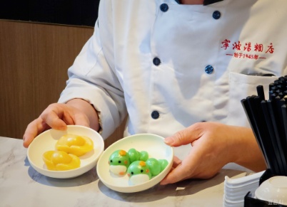 除了坚守传统外,宁波汤团店也在发力挑战创新,从前年起他们尝试推出了兔年、龙年主题的生肖汤团,把十二生肖与汤团这一传统美食通过点心师的手进行巧妙融合,获得了广泛赞誉。今年,这里再次创新推出蛇年生肖汤团——“蛇来运转”,被不少消费者誉为“蛇宝汤团”。
