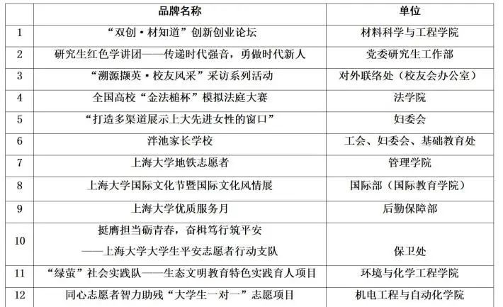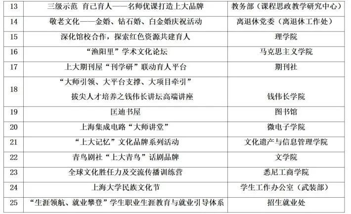 经过基层单位申报、初评、网络投票、答辩展示与专家评审,着重考虑品牌的内容、影响力、覆盖面等,共有25个项目获评上海大学第七届校园文化建设品牌。