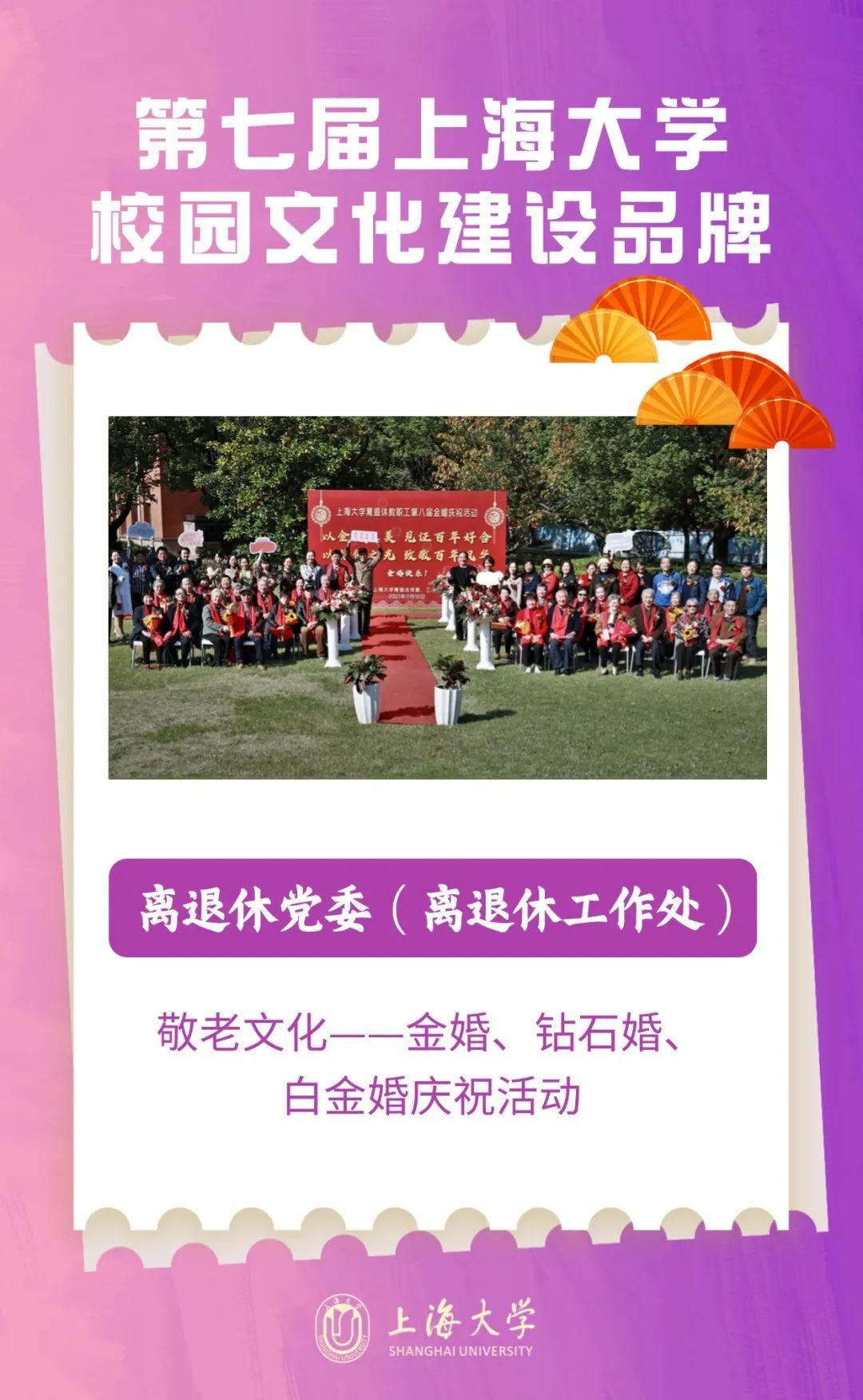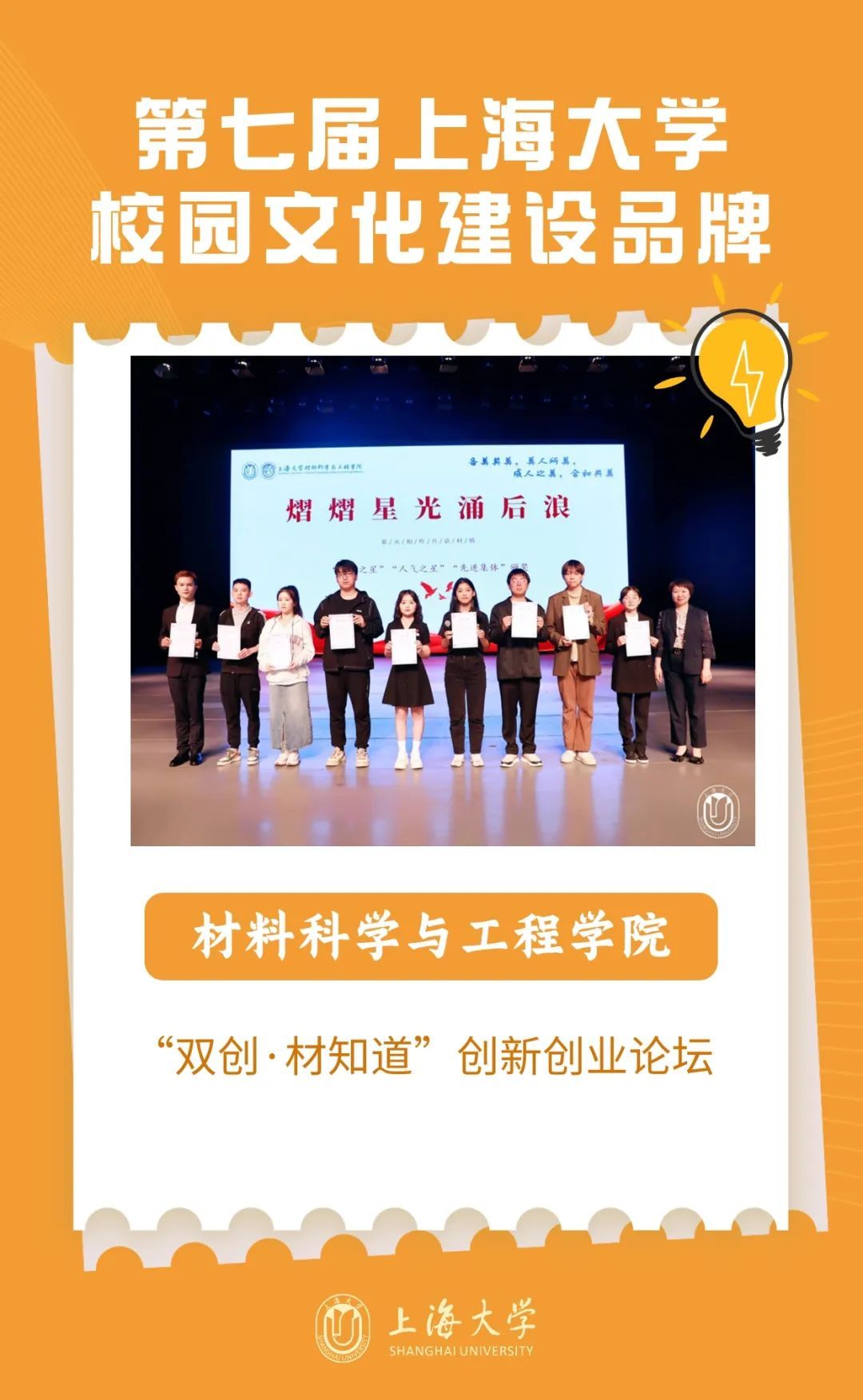 第七届校园文化建设品牌涵盖思想建设、讲座论坛、科创实践、文化节庆、艺术校园、公益服务等领域,或经过多年建设,或新挖掘培育,都有着较大的覆盖面和影响力,在校园文化建设中起到了引领和示范作用,促进学生良好品格的塑造和才能的发展,展现了上海大学校园文化建设成果。