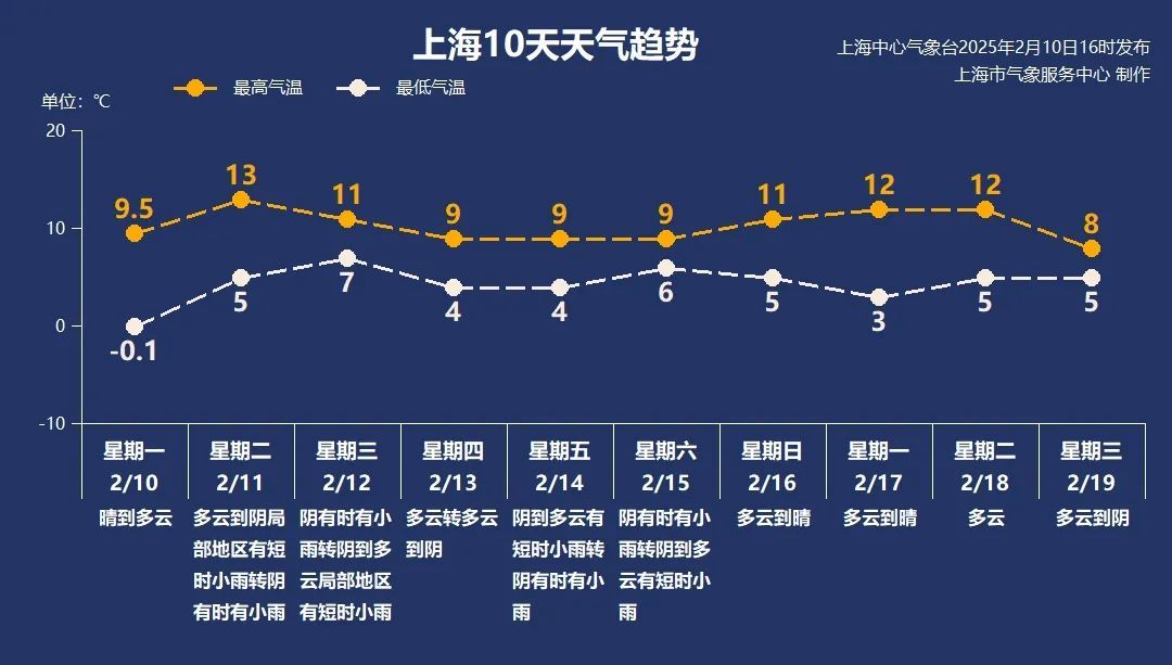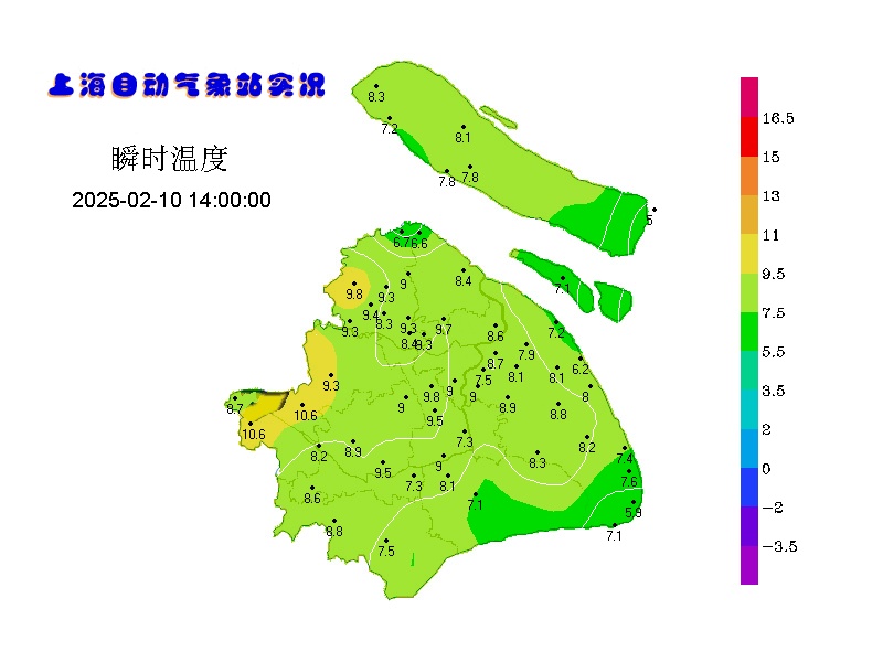 今晨依旧能感受到这波冷空气的余威,市区徐家汇站最低气温零下0.1℃,郊区在零下6℃到0℃之间。白天在偏南风和阳光的共同作用下,气温有了起色,午后市区徐家汇站最高9.5℃,阳光下走走还是很舒适的,但早晚寒意重,保暖依旧别松懈。