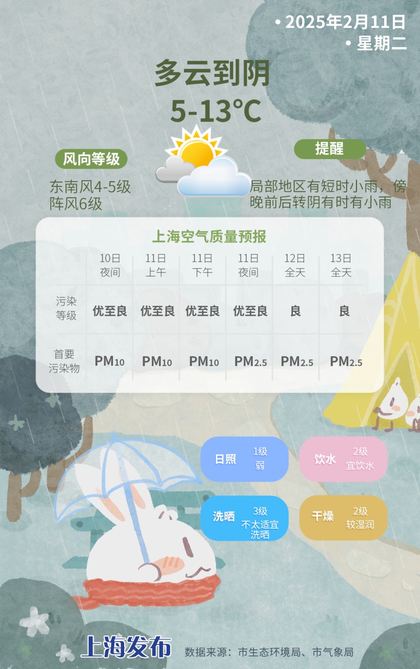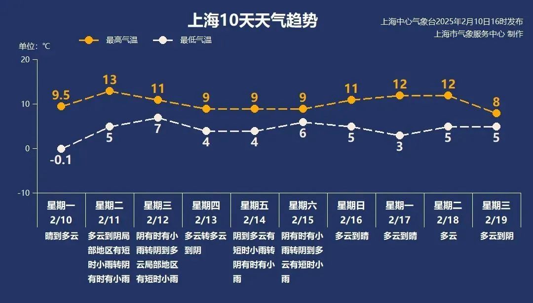 带伞出门 暖湿气流带来降水 大家出行带好雨具 今日天气 今天上海转为多云到阴局部有短时小雨,傍晚起雨水更明显一些,阴有时有小雨,请留意道路交通安全。东南风4-5级阵风6级,气温继续回升,早晨市区最低气温5℃,大部分郊区也将升至零度以上,最高气温重回两位数,预计可达13℃,相对湿度90%-50%,体感相对较暖湿。 天气趋势 受冷暖空气共同影响,本周阴雨天气增多,降水过程分别出现在周二周三,以及周五周六,大家外出记得备好雨伞。受冷空气扩散影响,周三起气温再次下调,周四起最高气温将跌至个位数,最低气温在4~6℃。周日晴天回归,白天气温小幅度回升。 新的一周晴雨转换快,气温也是起起伏伏,还请大家及时留意天气变化,注意冷暖。