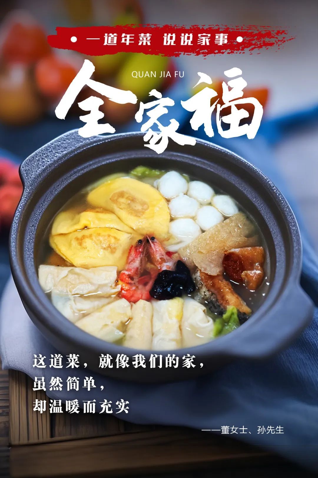 董女士介绍,全家福里有蛋饺、鱼丸、肉皮、爆鱼、百叶包、黑木耳、鲜虾和白菜这八种菜品,而数字“8”的发音与“发”相近,象征八方来财。一锅全家福里不仅有酷似金元宝的蛋饺、象征团圆的鱼丸,还有寓意吉祥的“福袋”百叶包……全家福,这道年菜中的头菜,寓意着全家幸福美满。