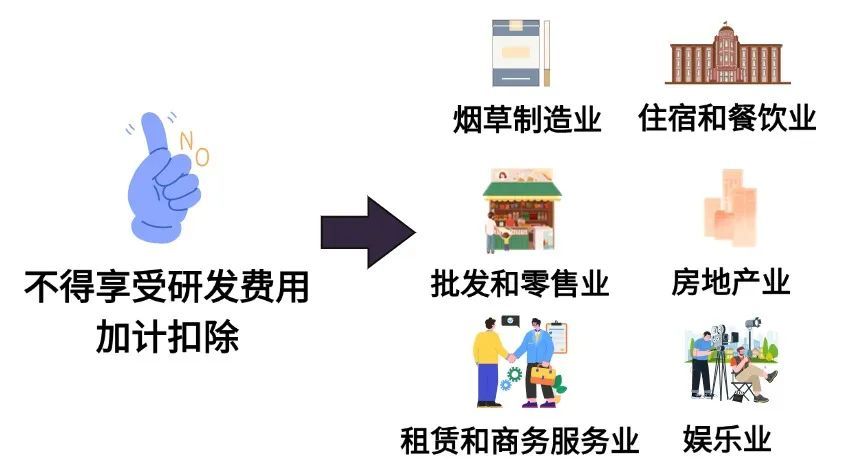 根据《财政部 国家税务总局 科技部关于完善研究开发费用税前加计扣除政策的通知》(财税〔2015〕119号)规定,烟草制造业、住宿和餐饮业、批发和零售业、房地产业、租赁和商务服务业、娱乐业不得享受研发费用加计扣除。