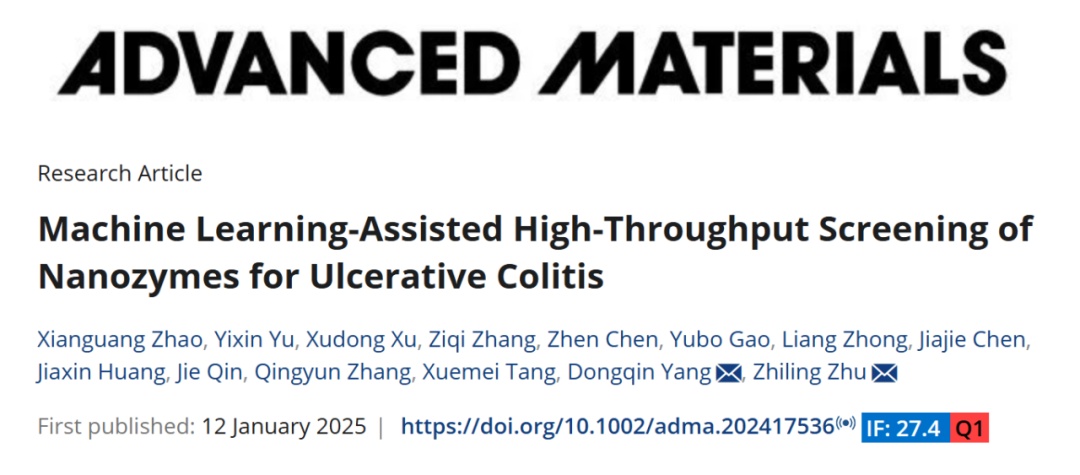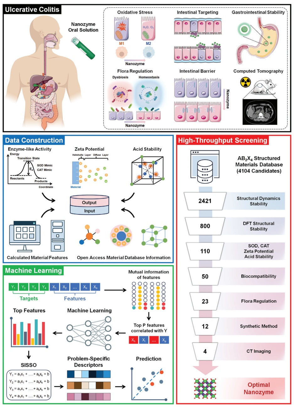 近日,复旦大学附属华山医院联合青岛科技大学材料学院,在国际期刊Advanced Materials(IF=27.4)在线发表题为Machine Learning-Assisted High-Throughput Screening of Nanozymes for Ulcerative Colitis的研究论文。团队在前作基础上(Adv Mater. 2023 Nov;35(44):e2304967.),通过机器学习(ML)辅助的高通量筛选策略,成功开发出兼具抗氧化、抗炎、肠道菌群调控及CT成像功能的多功能纳米酶SrDy2O4,为溃疡性结肠炎(UC)治疗提供了全新的“诊疗一体化”解决方案。