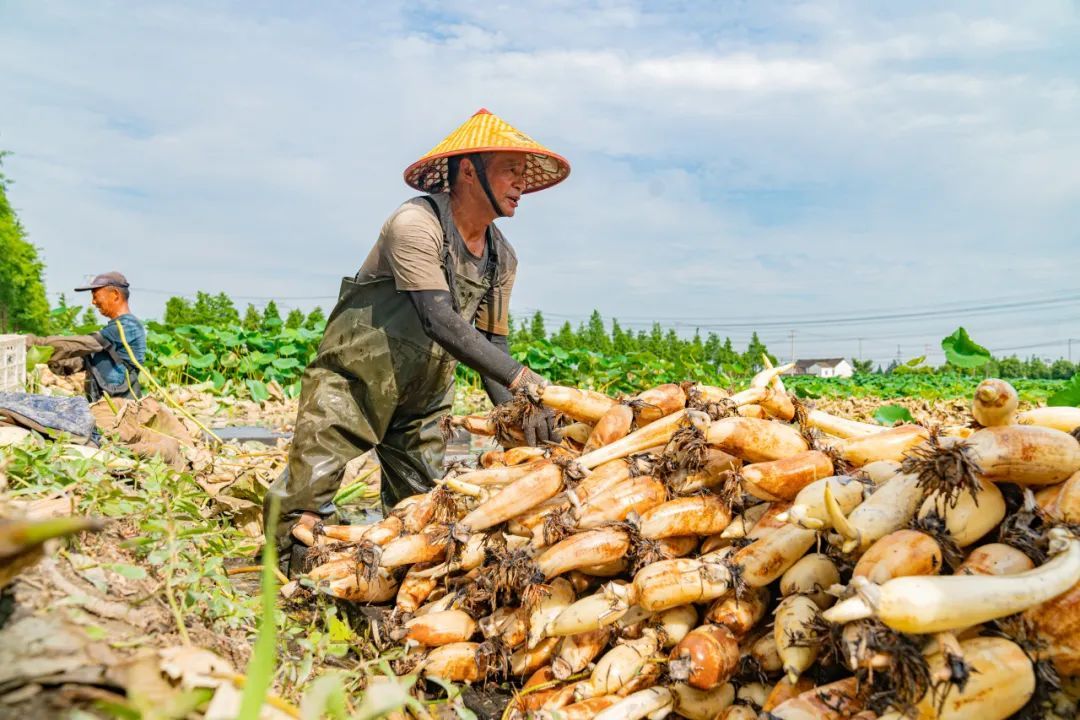 每到金秋时节,就是莲藕丰收的时候。走进青浦区“水八仙”种植基地——上海佳欣茭白专业合作社,藕塘里一派热闹的丰收景象。满塘的莲藕已逐渐由碧绿色变为“黄金叶”,身穿连体渔裤的采藕工一手拿着用来冲洗淤泥的水枪,一手在淤泥中摸索着,沉睡在泥中的洁白粗壮的莲藕被温柔地唤醒,逐一浮出水面。
