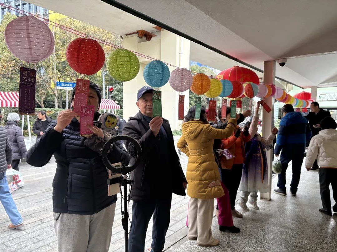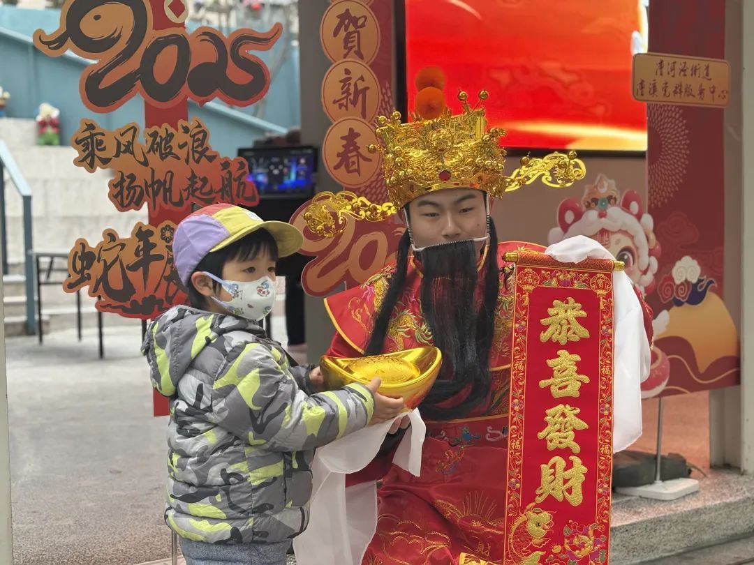 现代的套圈游戏和古代的投壶相映成趣,让居民在古今之间体会趣味,同时还能收获满满的乐趣和奖品。糖画体验则考验居民们的动手能力和耐力,灵巧的双手在热乎乎的糖稀上勾勒出各式各样的图案。拿着“恭喜发财”对联和金元宝的财神爷是本次活动的人气王,无论是大朋友还是小朋友,都争先恐后地与其合影留念,希冀在新的一年里带来财气与福气。