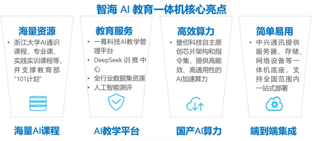 DeepSeek 通过技术创新推动教育变革,为教育方式和未来发展带来了深刻启示。浙江大学作为全国首批设立人工智能本科专业的 35 所高校之一,拥有产教融合平台和国家教材基地,智海平台则入选教育部“人工智能+高等教育”案例,支撑起教育部 “101 计划”、人工智能通识课试点等工作,接入了DeepSeek和“智海-三乐”教育大模型等国产大模型,为教学一线的关键环节赋能。