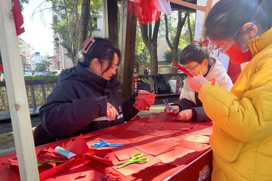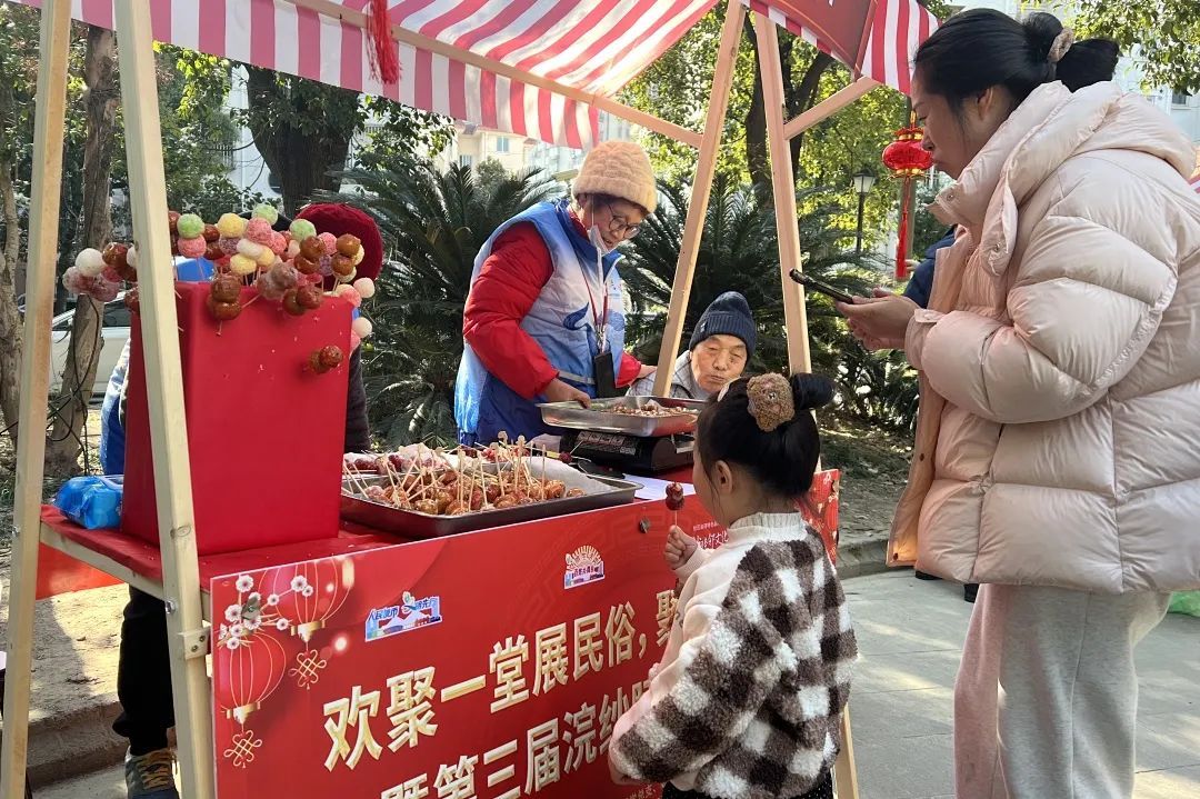 除了文艺演出,周围还有热闹的元宵市集。从煮汤团、糖葫芦等节日美食摊位,到制作传统拨浪鼓、平安结等传统文化氛围满满的手工摊位,吸引不少居民带着孩子前来,穿梭在一个个摊位间,收获了许多惊喜。
