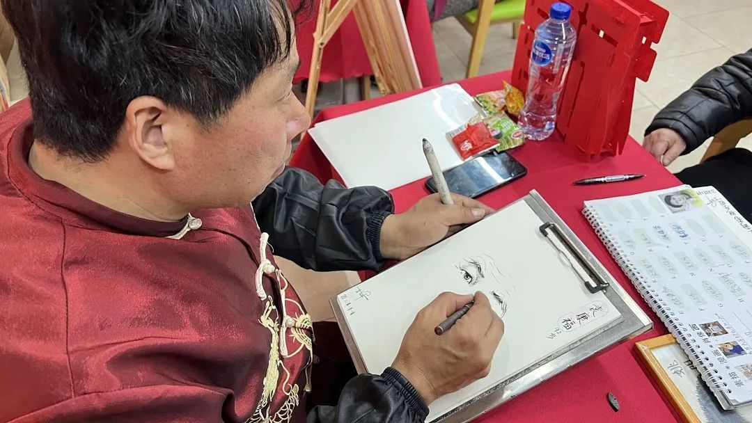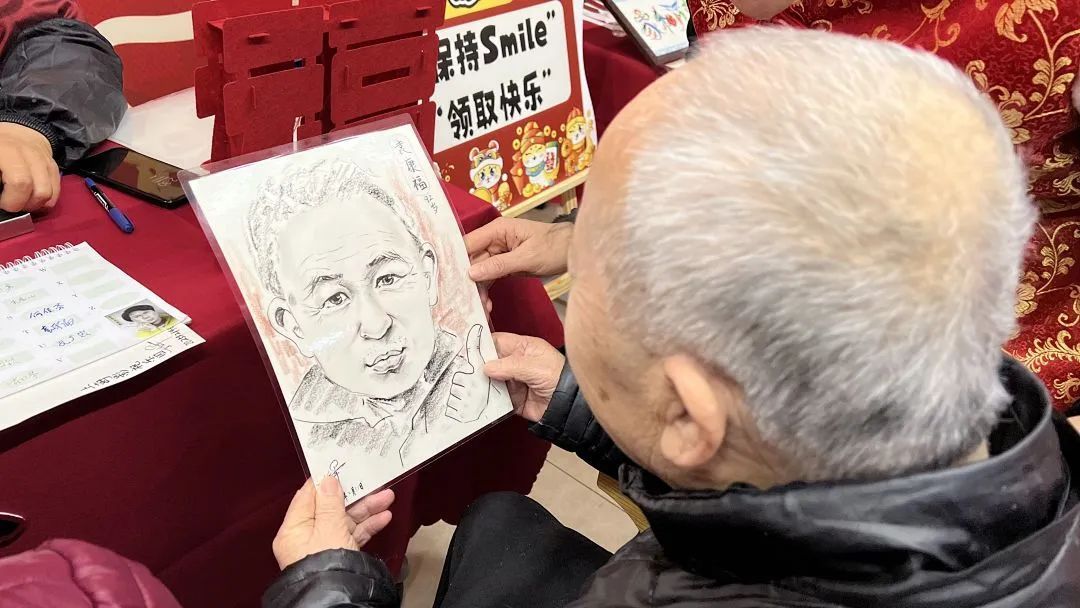 猜灯谜、现场作画等活动也深受老人们的欢迎。今年92岁高龄的袁老伯虽然有点认知障碍,但对于逛灯会的情怀不减,配合地坐在画师面前,画了一幅可爱的卡通画。