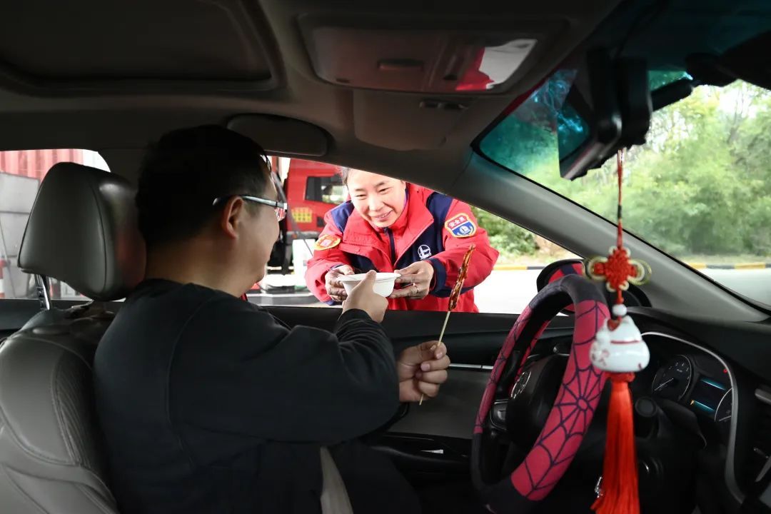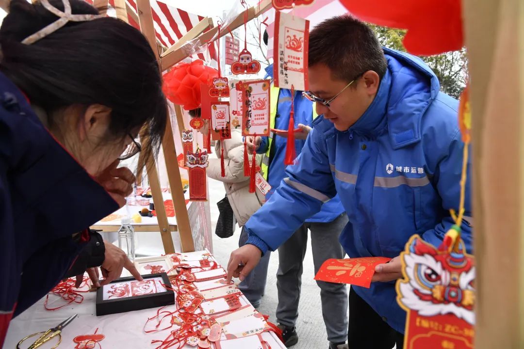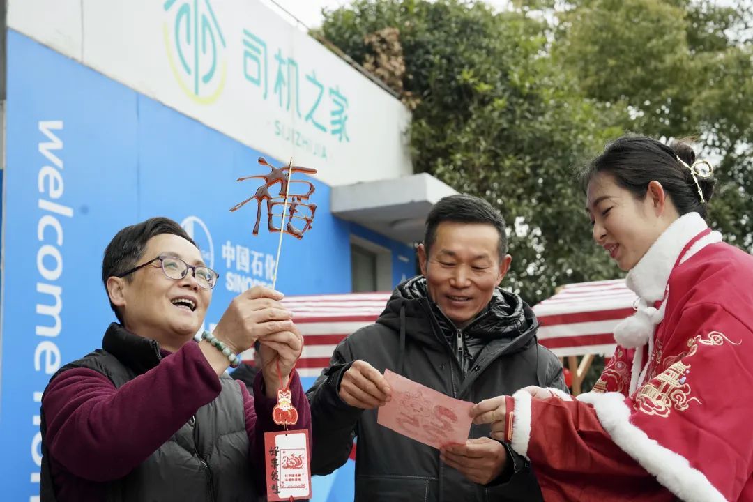 拓印区域人气高涨,展位前人头攒动,由剪纸非遗项目传承人设计的“蛇盘兔”拓印图案,寓意着新的一年里财源广进的美好心愿。加油站志愿者提前将剪纸图案制成印章,书写好心愿卡,制成精致挂饰,帮车友系挂在驾驶室。卡车司机钱师傅吃着汤圆说道,“这个活动特别好,特地做了这个心愿卡,希望新的一年越来越好。”