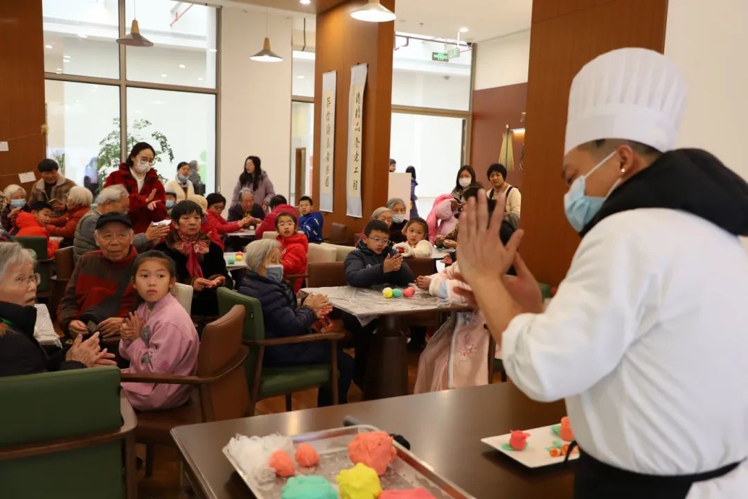 活动的压轴环节是非遗手作——面塑。乐龄汇养老院特别邀请了院内大厨现场教授面塑技艺,让长者和小志愿者们一同动手体验传统文化的魅力。在大厨的指导下,大家将五颜六色的面团变成了一朵朵娇艳的花卉,还有形态各异的元宵造型。老少之间相互学习、相互帮助,现场充满了浓厚的节日氛围。
