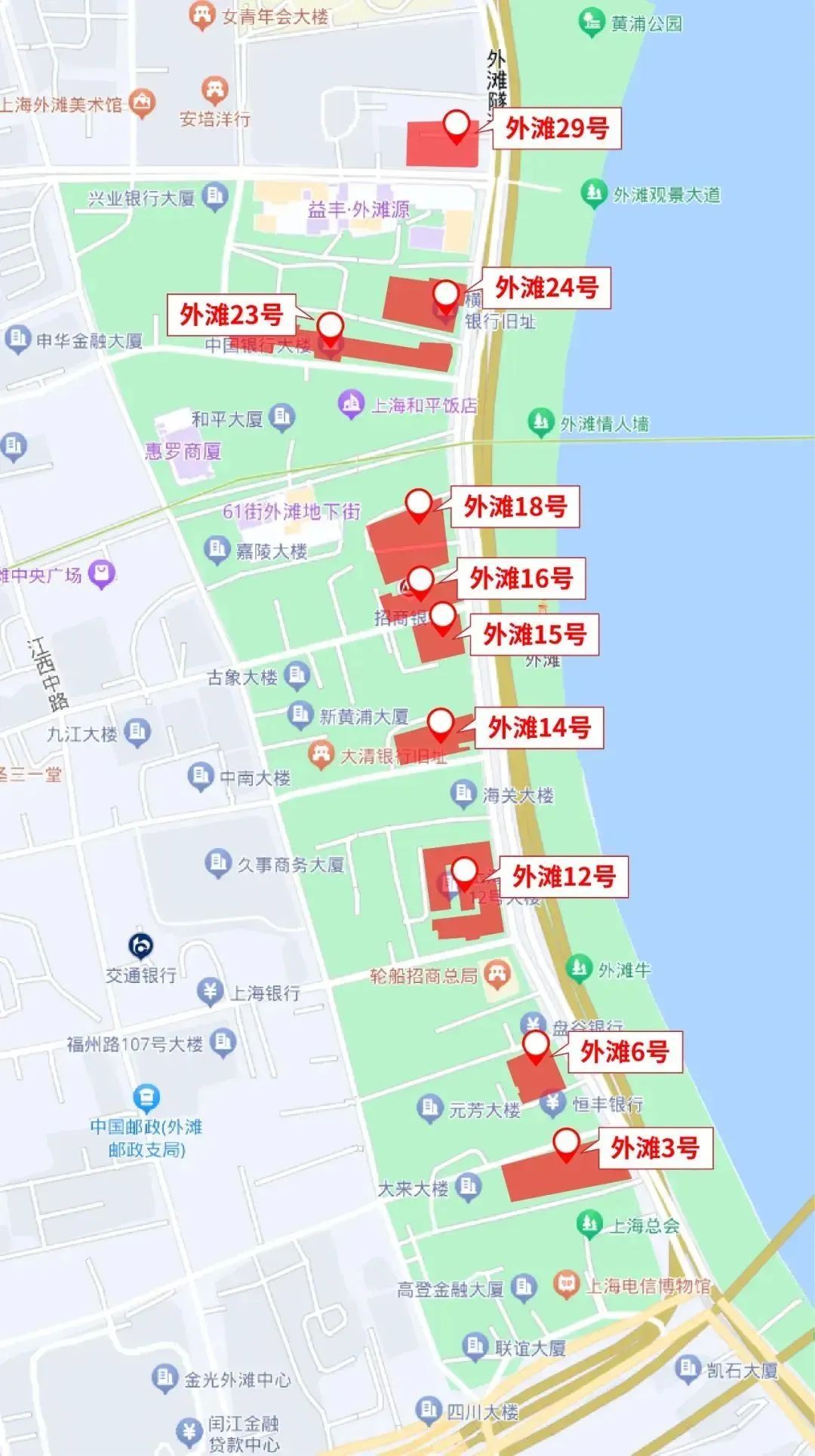 品读“外滩第一立面”的建筑风韵 中山东一路上的历史建筑群不仅是上海的地标性景观,更见证了上海的开放与崛起,这里的每一栋建筑都有其独特的历史背景和文化意义,被誉为“万国建筑博览群”。由于这些建筑面朝黄浦江,外观壮丽且统一,因此亦被称为“外滩第一立面”。 历史的厚重与现代的活力在这里交织碰撞,形成了独特的城市风貌。漫步中山东一路,穿梭于这些建筑之间,感受外滩第一立面背后的独特韵味与历史底蕴。 中山东一路沿线酒店建筑 外滩2号上海外滩华尔道夫酒店 外滩19号原汇中饭店,现和平饭店南楼 外滩20号和平饭店 线路推荐 中山东一路沿线航运建筑 外滩5号 外滩9号 外滩13号 外滩28号 线路推荐 中山东一路沿线金融建筑 外滩3号 外滩12号 外滩15号 外滩16号 线路推荐 品读历史建筑的焕然新生 在外滩的非临江建筑背后,有141幢老建筑演绎了另一番历史风貌,展现了上海城市软实力的神韵魅力,也为市民打开一片城市的新空间。如今一幢幢历史建筑通过一系列的精雕细琢、修旧如旧和功能重塑,实现空间再造和功能转换,成为城市更新的典范。 外滩“第二立面”东至圆明园路-天津路-四川中路,西至河南中路,南至延安东路,北至南苏州路。行走其间,领略这些历史建筑所散发的独特魅力。 外滩第二立面之九江路 九江路36号原中华邮政 九江路201号圣三一堂 九江路219号中国基督教协会 九江路230号大生公司大楼 线路推荐 外滩第二立面之江西中路 江西中路138号祥泰银行旧址 江西中路181号原建设大楼 江西中路222号原浙江第一商业银行 江西中路250号原聚兴城银行大楼 线路推荐 外滩第二立面之虎丘路 虎丘路20号原亚洲文会大楼 虎丘路128号原广学会大楼 虎丘路142~146号原光陆大戏院 线路推荐 外滩第二立面之汉口路 汉口路309号申报馆旧址 汉口路193号老市府大楼 汉口路110号中南大楼 线路推荐 选个好天气 一起去Citywalk吧~ 来源:乐游上海、上海黄浦 戳这里为我加颗小星星⭐️ 公众号一言不合就改版, “星标”我才能更方便接收消息哦。 现在只需三步: