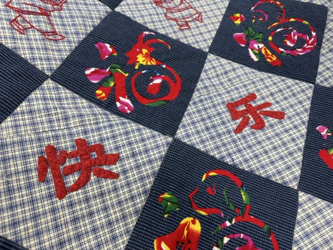 以黛蓝方格纹理的崇明土布打底,配以东北花布剪裁的十二生肖与福字结合的图案,“女红坊”的成员们手中的针线飞舞,一米见方的贺岁拼布作品逐渐成型。