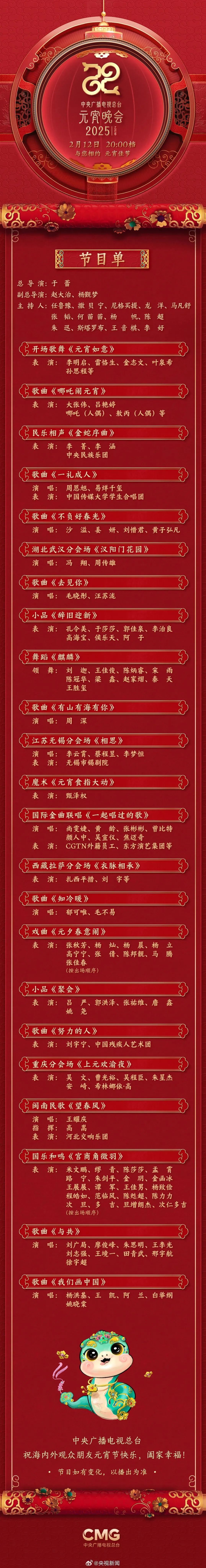 民乐相声《金蛇序曲》、小品《辞旧迎新》《聚会》、魔术《元宵食指大动》等节目让快乐升级。从川江号子的激情热辣到汉阳门花园的江湖气派,从青藏高原的雪山圣湖到江南水乡的烟雨楼台,重庆、湖北武汉、西藏拉萨、江苏无锡四地分会场以山河为舞台,在璀璨灯火中携手联欢,共庆佳节。