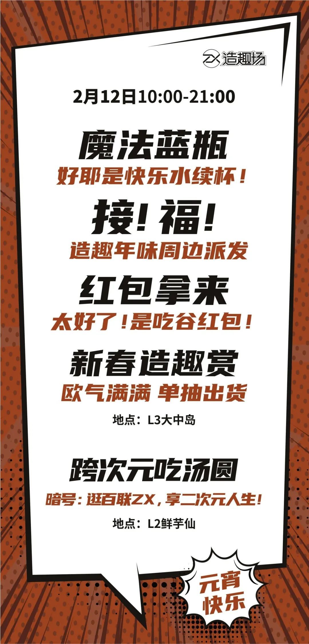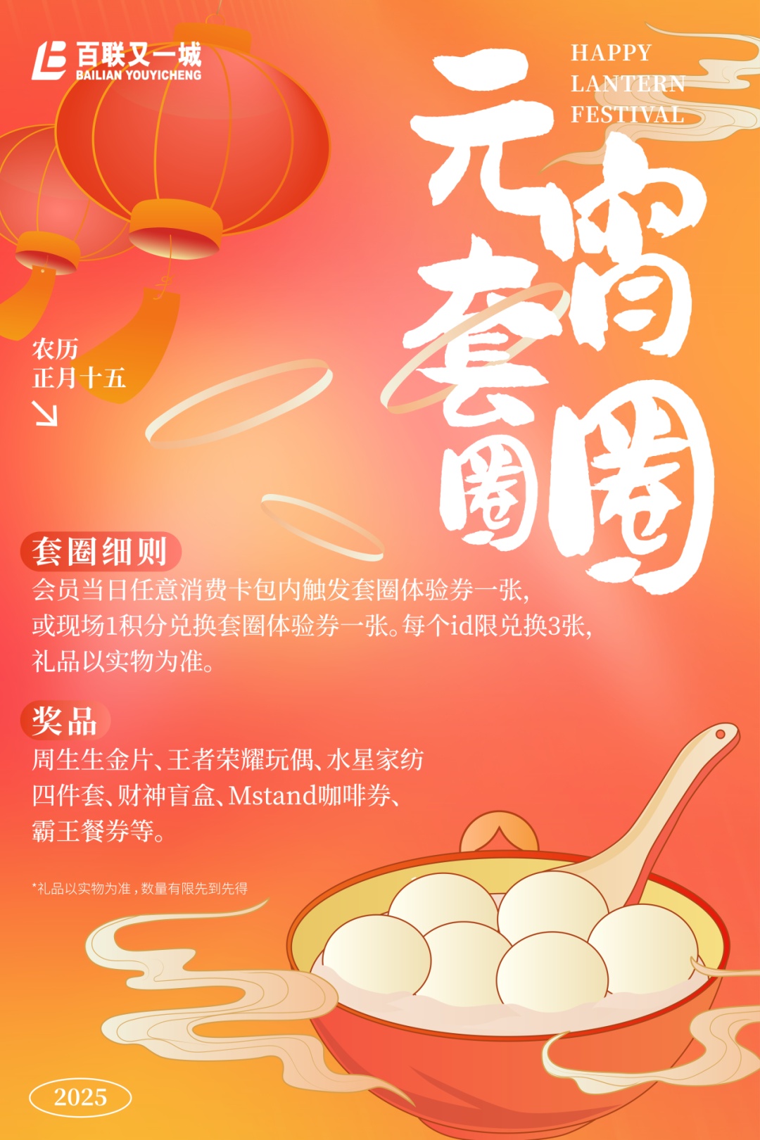 跨次元元宵限定体验,新春造趣赏、套圈体验赢王者荣耀玩偶,尽在百联又一城、百联ZX造趣场!同时,百联又一城开启新春惊喜,满减至高500元、79团100抖音餐饮券等,更多福利敬请关注!