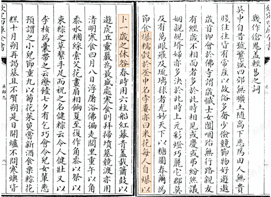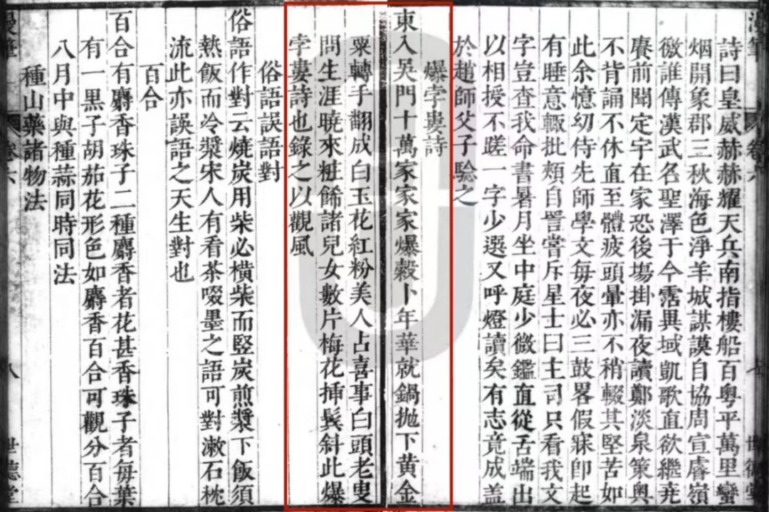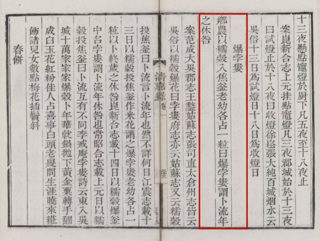 不仅如此,明代江阴文人李诩《戒庵老人漫笔》录有“爆孛娄诗”云:“东入吴门十万家,家家爆谷卜年华。就锅抛下黄金粟,转手翻成白玉花。红粉美人占喜事,白头老叟问生涯。晓来妆饰诸儿女,数片梅花插鬓斜。”诗文描写的正是爆米花的习俗。