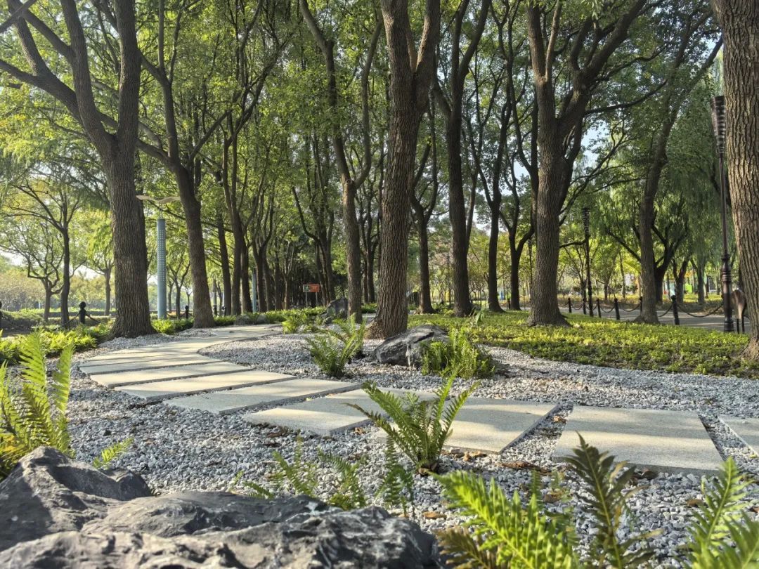 为了使绿化空间与人群活动结合,重点针对西门、东门入口、林下空间等区域,进行了改造升级,在林下空间增设步道、座椅,方便夏季纳凉散心。