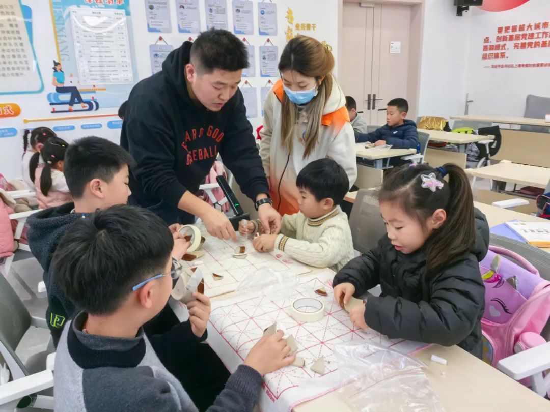 此外,松江区多个办班点也充分利用辖区资源,围绕中国传统文化推出了形式多样的办班内容。今年,新桥镇爱心寒托班推出“有年味的寒托班”,结合春节主题开展写春联、贴窗花、包饺子等传统文化活动;永丰街道办班点结合仓城历史文化风貌区资源,邀请江南曲圣纪念馆、松江布展示馆等特色场馆为孩子们带来昆曲体验等各类非遗活动;泗泾镇爱心寒托班则邀请泗泾镇善物文物修复工坊开设陶瓷修复课程,为小学生们打造充满传统文化,趣味科普的寒假乐园。
