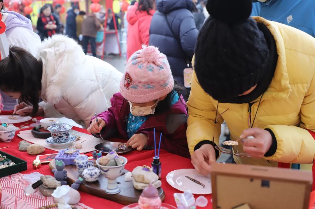 翻花、珠串体验、海派结艺等传统技艺摊位前人头攒动,市民们纷纷上手体验,感受指尖上的文化魅力。手绘脸谱、元宵拓印、元宵花灯等传统手工艺活动的摊位更是人气爆棚、排起长龙,吸引了众多亲子家庭的热情参与。孩子们在家长的陪伴下,沉浸其中,共同传承着这份古老而珍贵的文化记忆,让传统技艺在新时代焕发出新的生机与活力。