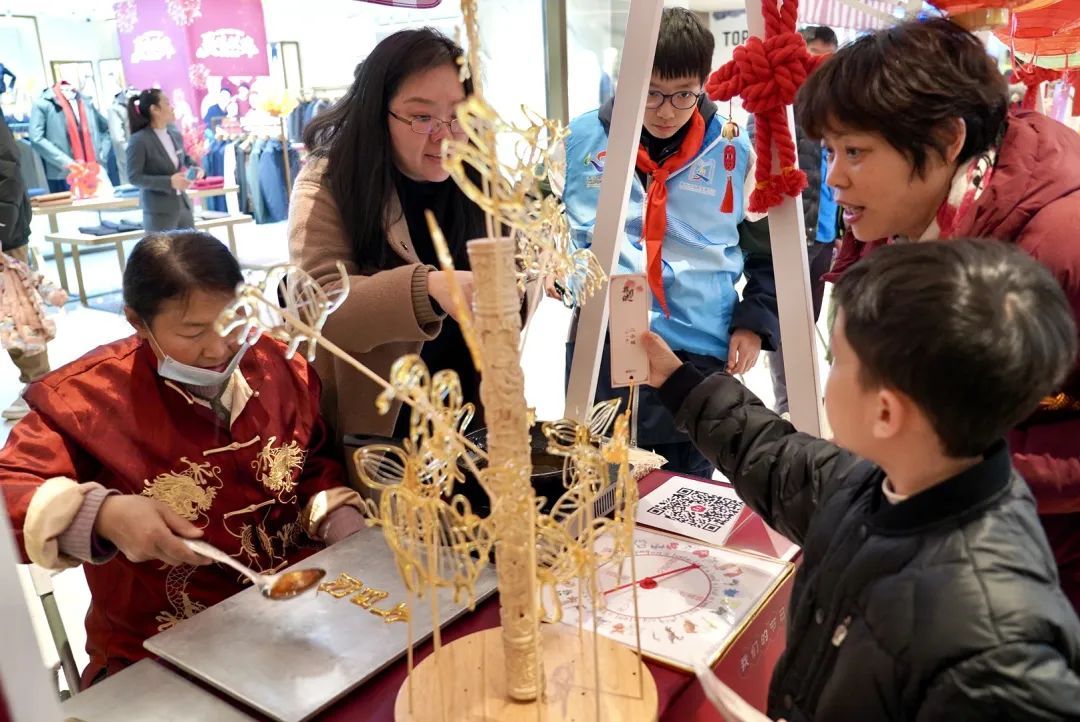 “想画什么?”“今年是蛇年,画条蛇吧!”非遗糖画摊位前人头攒动,空气中弥漫着焦糖的甜香,只见糖画传人用勺子从碗中捞取糖浆,寥寥几笔,一条小蛇便勾勒出来。“真好看!”一旁围观的孩子们开心地说道。