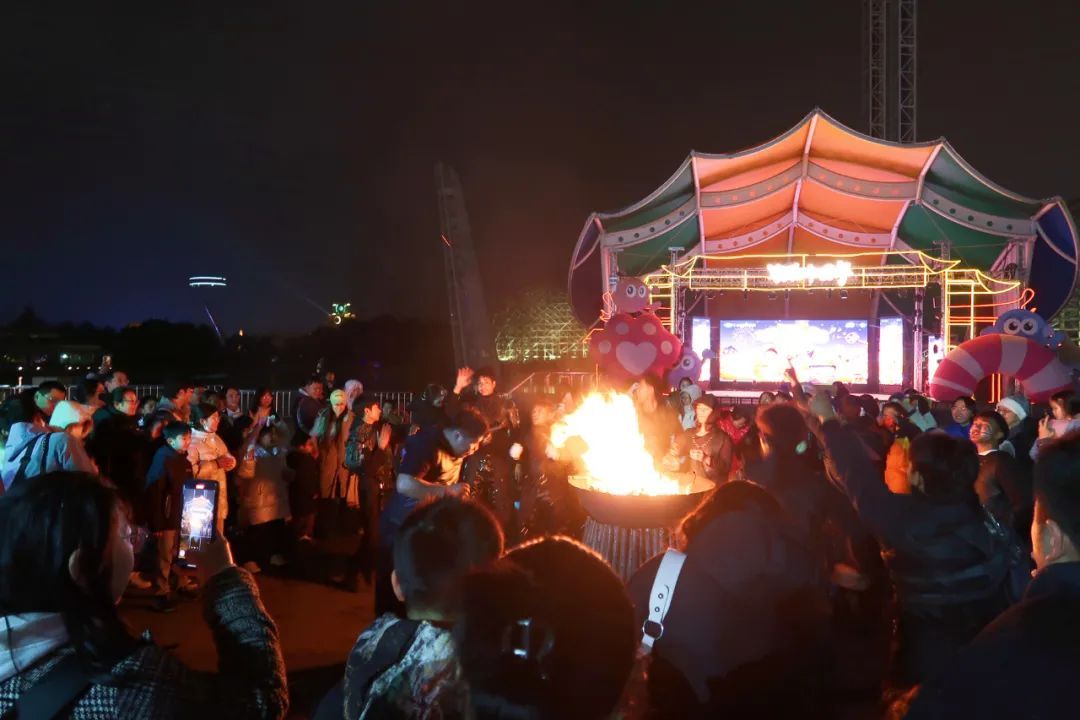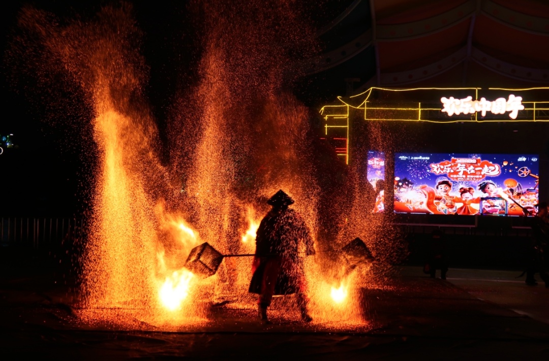 “涅火神域”非遗演艺环节则将园内气氛推向高潮。民间艺人手持火壶,壶中火焰熊熊燃烧,在夜色中划出绚丽的轨迹,火花飞溅如点点繁星,呈现一场充满惊险又浪漫的视觉盛宴,引得现场观众惊叹连连,纷纷举起手机记录这一震撼瞬间。滚灯、鱼灯等传统非遗项目也轮番登场,让人目不暇接,游客们仿佛置身于一场浪漫的中式美学盛典之中。游客彭女士和朋友特地来上海欢乐谷过元宵节,她告诉记者:“今年元宵节融入非遗元素,让传统文化走进年轻人的生活,国潮和现代感交织,很惊艳。”
