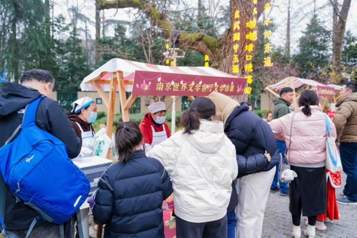 “张‘灯’结‘友’”文学灯集,由南京市文学之都促进会、南京朝天宫街道、南京创意中心以及“我们的节日”工作室共同发起。活动将南京浓郁的烟火气巧妙地“搬”进了世界文学客厅。芳婆糕团店、李记清真馆、老米记酒酿铺、孟令军炒货……这些深受南京市民和八方游客喜爱的“顶流”小店,汇聚一堂,为大家带来一场令人垂涎的味蕾盛宴。