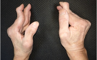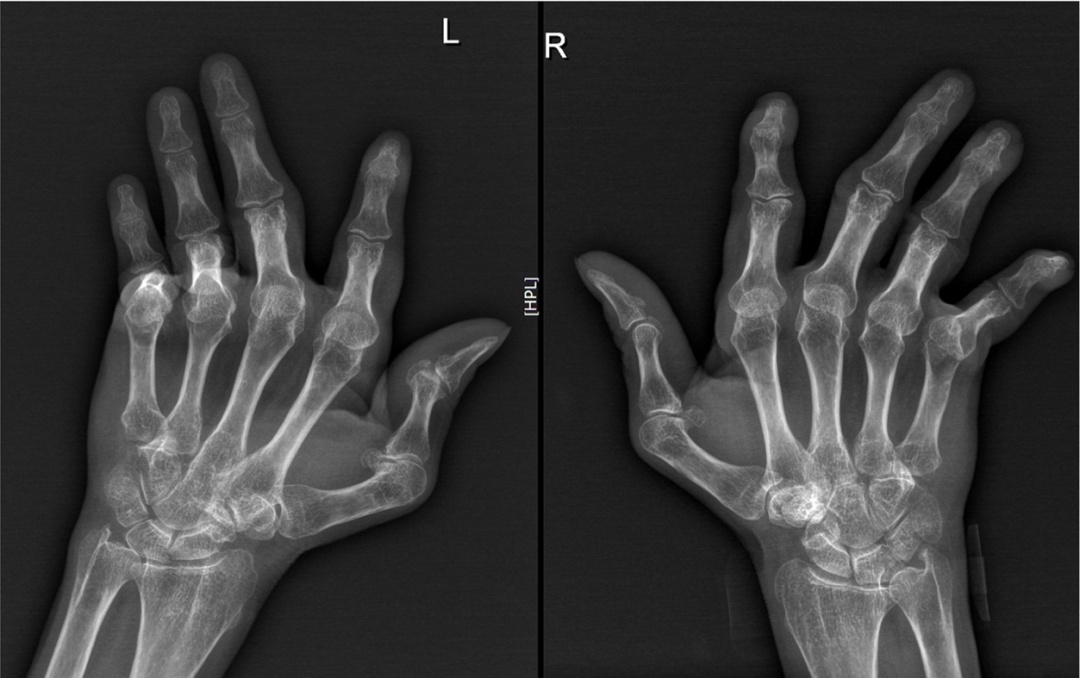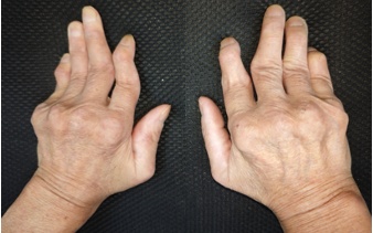 双手关节畸形:拇指Z字形变,掌指关节尺侧偏曲,指间关节“天鹅颈样”畸形;X片示多发掌指关节、指间关节半脱位,关节面光整无侵蚀,骨密度减低