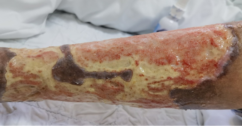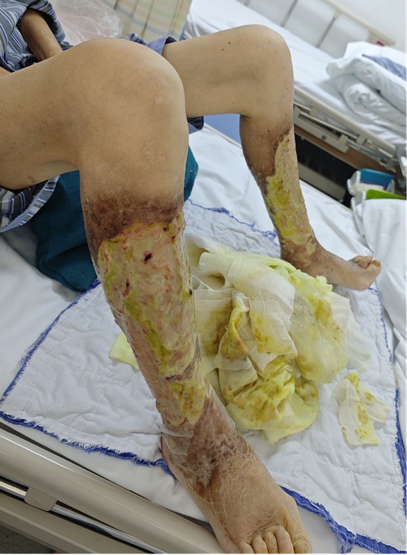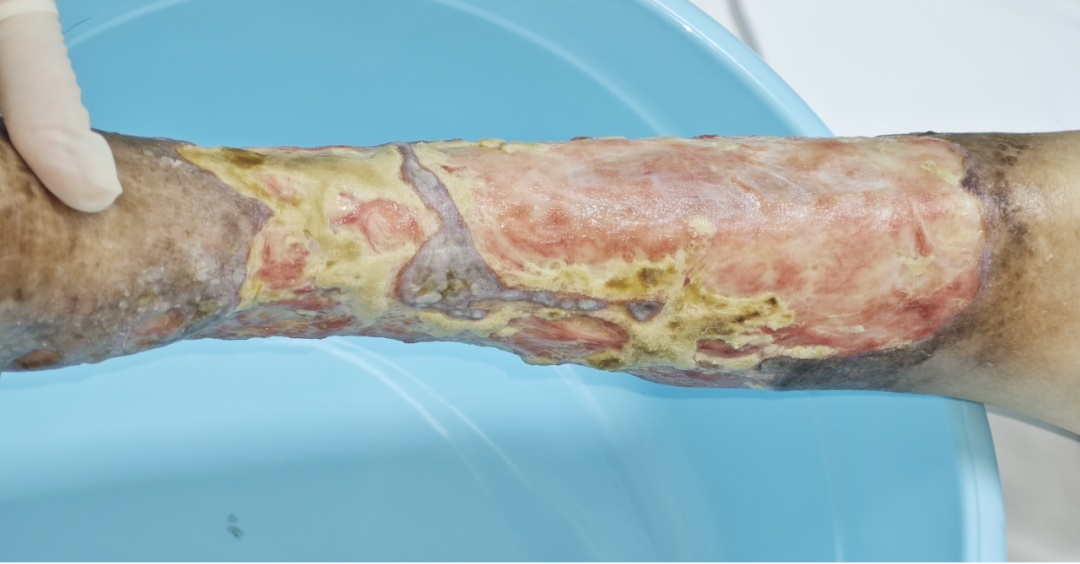 我叫张嘉艺,是瑞金医院皮肤科规培住院医师。在皮肤科轮转时,常常能遇到一些令人难忘的病例,57岁的王阿姨就是其中一位。那天,她坐着轮椅被推进诊室,脸色苍白,双小腿裹着厚厚的纱布,渗出黄色液体,散发着绿脓杆菌特有的气味。揭开纱布,瘦弱的小腿上布满了巨大的溃疡。