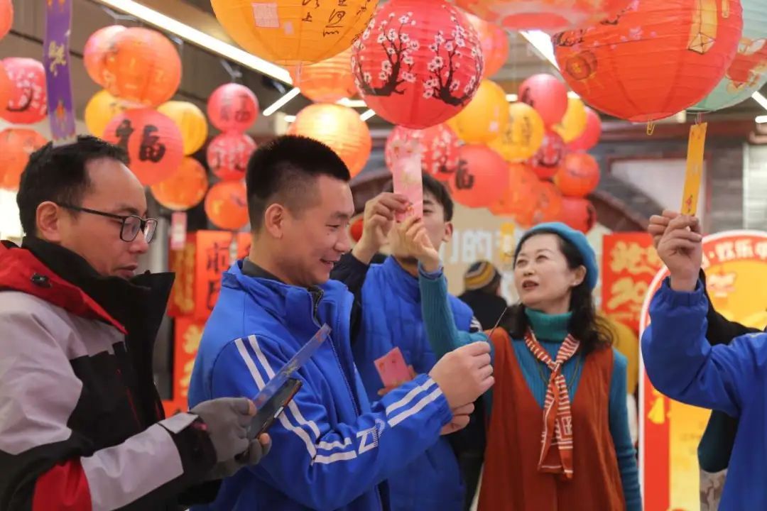 年味浓浓的氛围布置,让社区居民和小哥们纷纷驻足合影留念,记录下元宵佳节的美好瞬间;象征着团圆和幸福的灯笼下,欢声笑语不断,大家绞尽脑汁、踊跃竞猜灯谜,沉浸在解谜的妙趣和喜乐中。