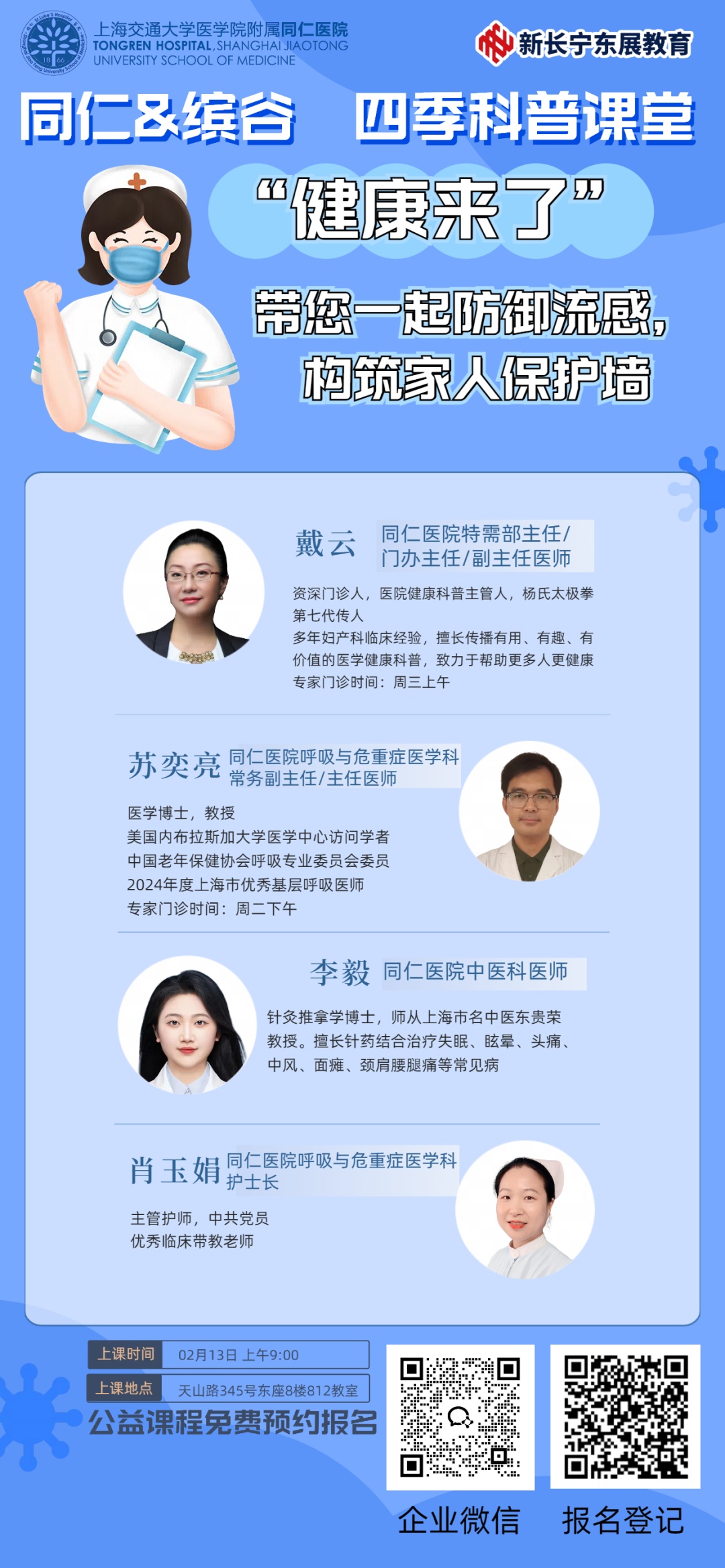 明天(2月13日)9:00—10:00,“上海长宁”APP将与上海市同仁医院、新长宁东展教育共同直播:“健康来了”,带您一起防御流感,构筑家人保护墙。